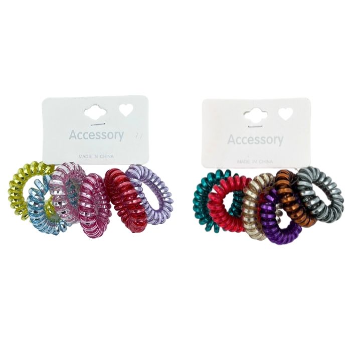 Spiraal elastiekjes in diverse kleuren. Spiraal elastiekjes zorgen ervoor dat je haar minder beschadigt en dat de haarpunten niet splijten. Eén set bevat zes elastiekjes. Je ontvangt een willekeurige set.