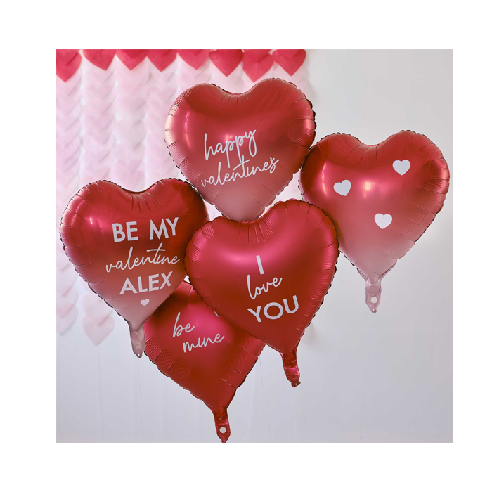 Zeg het met liefde met deze leuke aanpasbare Valentijnsballonnen. Elk pakket bevat 5x 18" foliehartballonnen in rood en ombré, met 14x witte stickervellen om te personaliseren en 6x 1m strengen doorzichtig touw.