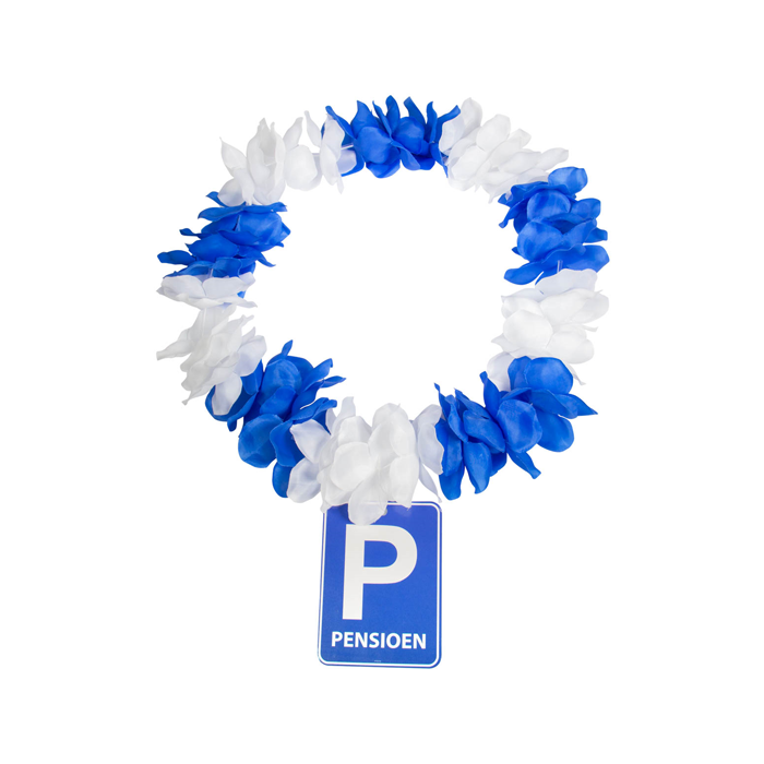 Pensioen Parkeerbord Hawaii Krans. Deze hawaii krans is ideaal te gebruiken als versiering op een pensioenfeest. De krans is blauw/wit van kleur en is gemaakt van polyester en karton. Het parkeerbordje met opdruk 'Pensioen' is dubbelzijdig bedrukt.