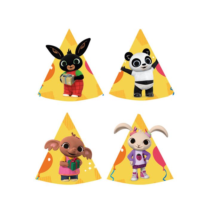 Vrolijke papieren feesthoedjes met Bing en zijn vrienden. De set bestaat uit acht hoedjes.