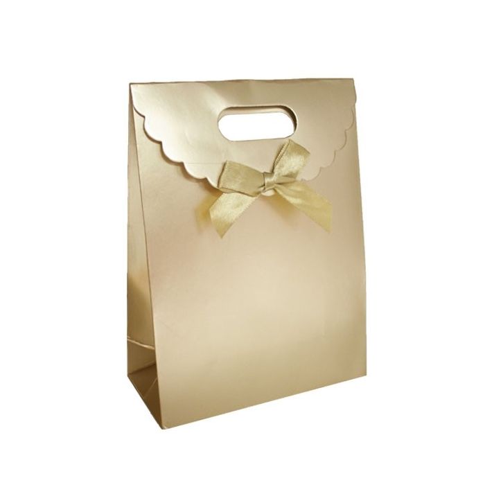 Kartonnen cadeautas met klittenband in de kleur goud. De afmeting van het tasje is 14,2 x 6,8 x 19,5 (lxbxh). Eén verpakking bevat 12 tasjes.