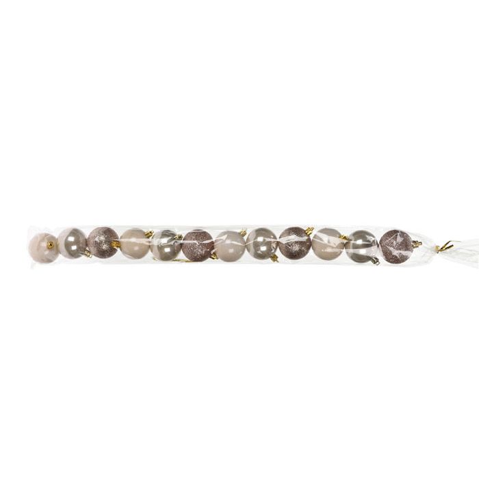 Set van 12 kerstballen in champagne kleur, met elk een diameter van 5 cm. De set bevat matte, glazende en glitter kerstballen.