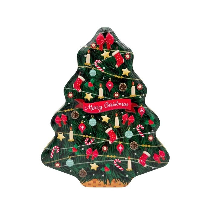 Verras vrienden, familie of collega's met dit sfeervolle kerstboomblik, gevuld met ongeveer 12 heerlijke chocolade pralines. Het blik, vormgegeven als een prachtig versierde kerstboom, is een lust voor het oog en een feest om te ontvangen. Met een gewicht van 120 gram aan kwaliteitschocolade is dit het perfecte cadeau voor elke chocoladeliefhebber tijdens de feestdagen. Dankzij de afmetingen van 230 x 155 x 35 mm past het gemakkelijk door de brievenbus. Zodra de pralines op zijn, blijft het decoratieve blik een mooie herinnering om kleine spulletjes in te bewaren.