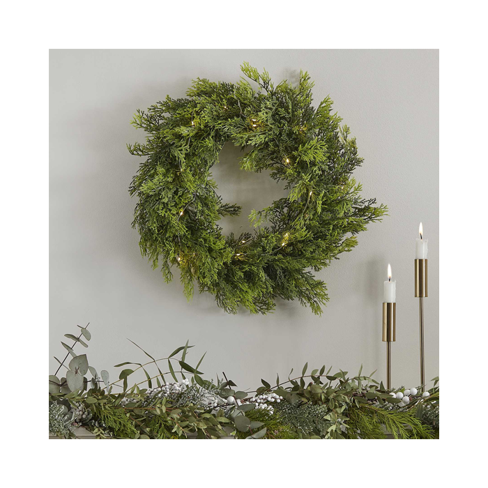 De typisch traditionele krans is voorzien van kunstmatig groenblijvend cederblad, aangevuld met fonkelende warmwitte lichten. Perfect voor boven een schoorsteenmantel of op een deur! De krans heeft een doorsnede van 45cm.