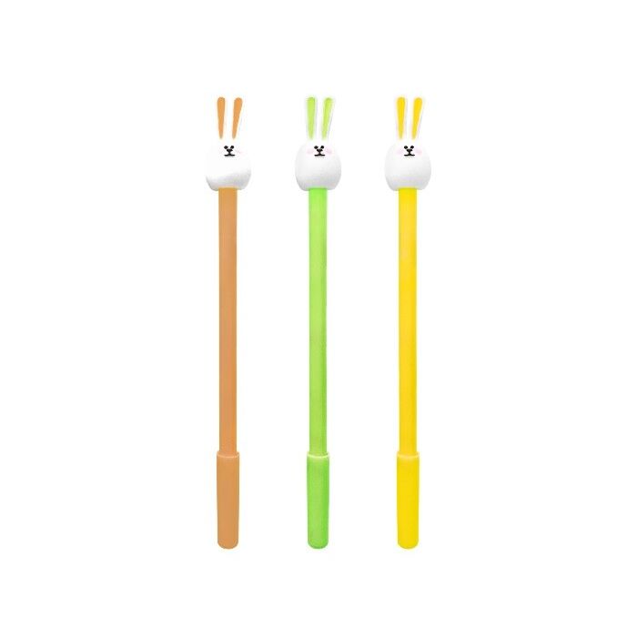 Softplastic fruit pennen met een fijne blauwe punt en bovenop een konijn. De pen is 18,5 cm lang. Een pak bevat 3 pennen. De kleuren van de pennen kunnen per pak verschillend zijn.