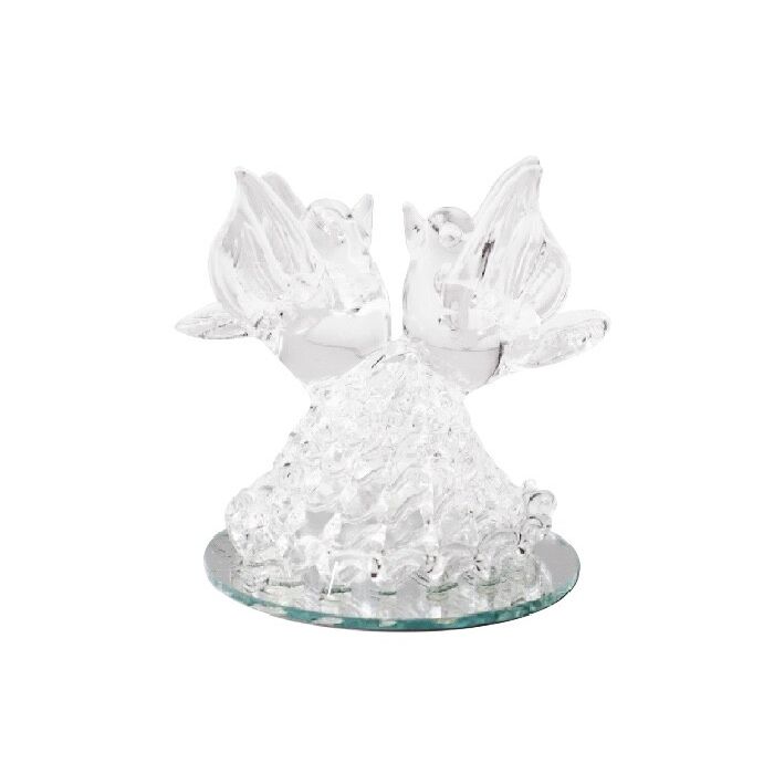 Kristallen tortelduifjes op een rots. Het kristallen tortelbeeldje is ca 5,5x3,5x5cm (LxBxH) en het spiegeltje heeft een dia van 4,3cm