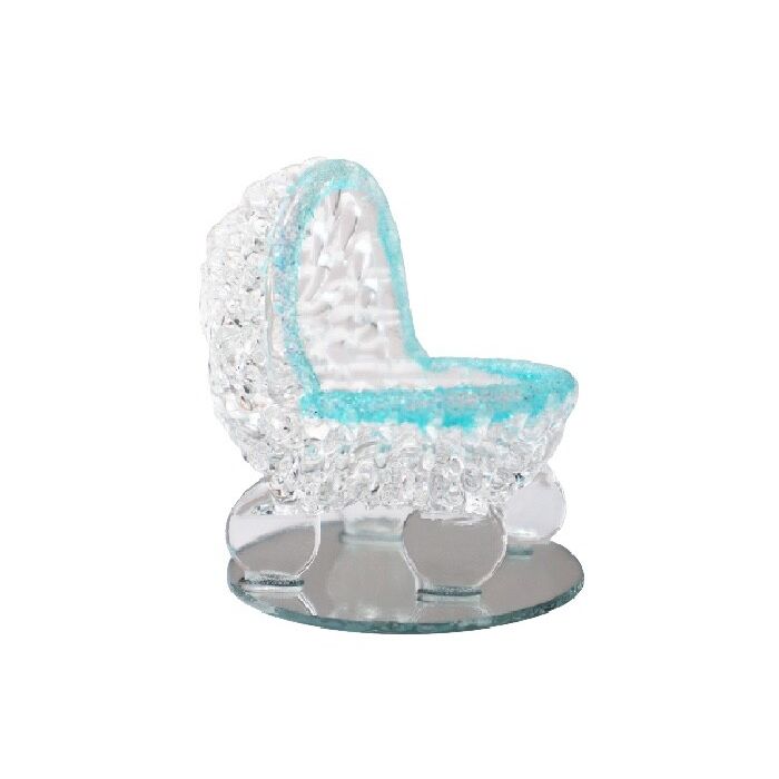 Kristallen wiegje op een spiegeltje. Het kristallen wieg beeldje is 4,5x3,5x5cm (LxBxH) en het spiegeltje heeft een dia van 4cm. Het beeldje wordt geleverd in een transparant doosje met een gouden of zilveren strikje.