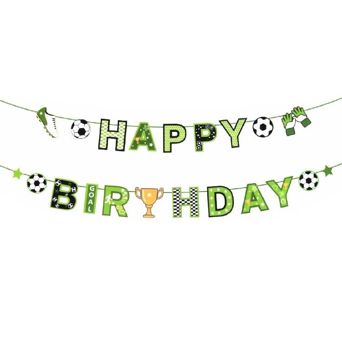 Happy Birthday slinger met een verschillende voetbal gerelateerde afbeeldingen. Perfect voor een verjaardagsfeestje met een voetbal thema! De slinger dient nog in elkaar geregen te worden. Satijnlint is in begrepen.