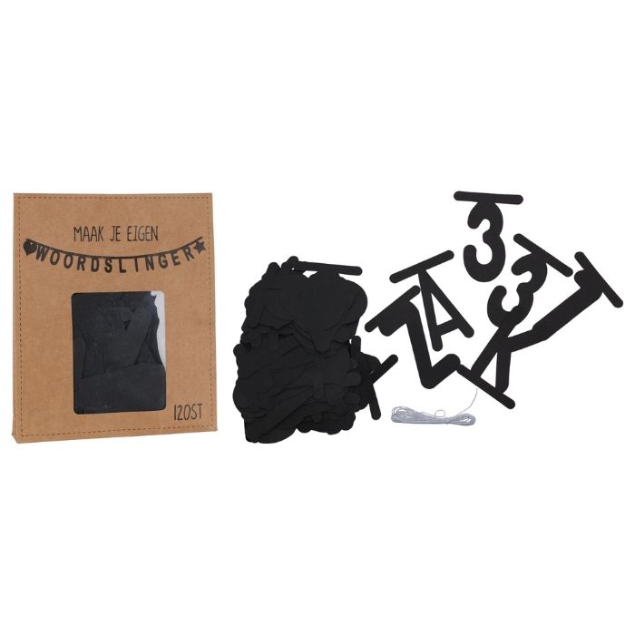 Met deze set zwarte letters, cijfers en symbolen kun je jouw eigen unieke woordslinger creëren. De set bevat 120 verschillende letters en cijfers, 3,2 meter elastiek en 90 splitpennen.