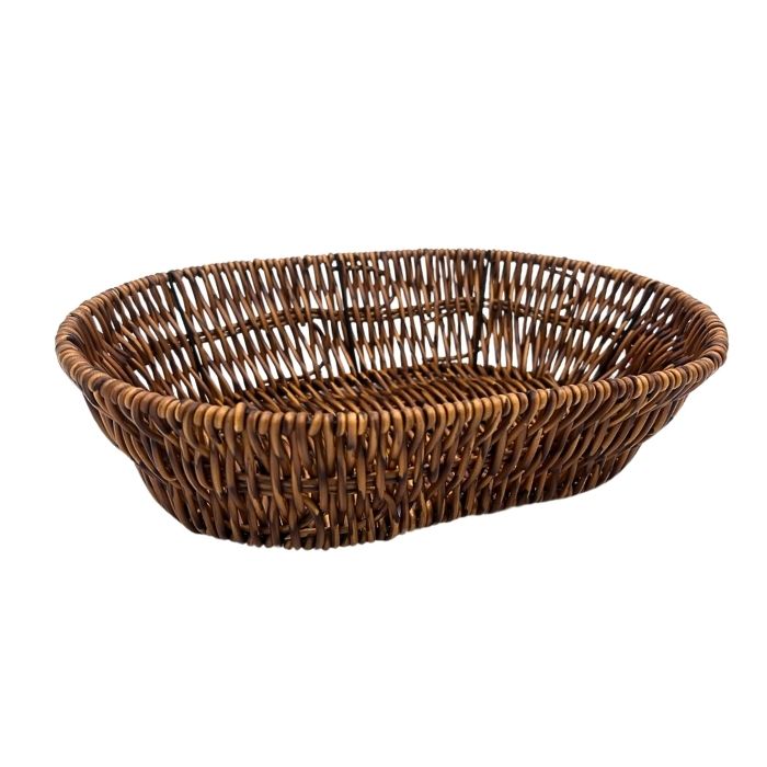Ovale, gevlochten mand in bruine kleur. Ideaal voor het serveren van brood, bewaren van fruit en andere voedsel. De mand heeft een afmeting van 28 x 20 x 7 (lengte bovenkant, breedte bovenkant, hoogte).