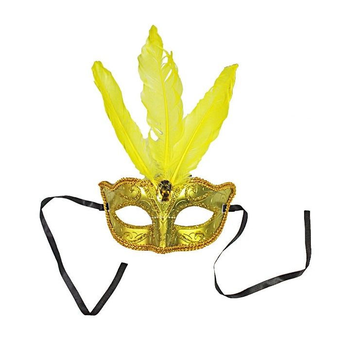 Mooie gouden masker met een sierlijke glitter look en drie grote veren. De afmetingen van het masker (excl. versiering) zijn 18 x 8 cm (BxH). Met versiering is het masker ca. 18 x 21,5 cm groot (BxH).
