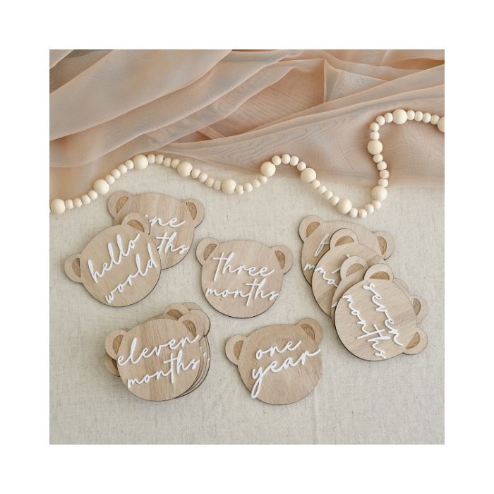 Geef de aanstaande ouders deze mooie houten mijlpaalbordjes voor baby's, perfect om het eerste levensjaar van je kleintje vast te leggen, en een mooi kraamcadeau. Met prachtige karameltinten en houten accenten is onze teddyberencollectie perfect om de nieuwe aanwinst te vieren. We can bear-ly wait!