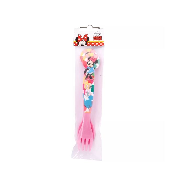 Set van 2 herbruikbare kunststof kinderbestek bestaande uit een Minnie Mouse vork en lepel, met versierde handvatten. Gemaakt van BPA-vrij plastic.