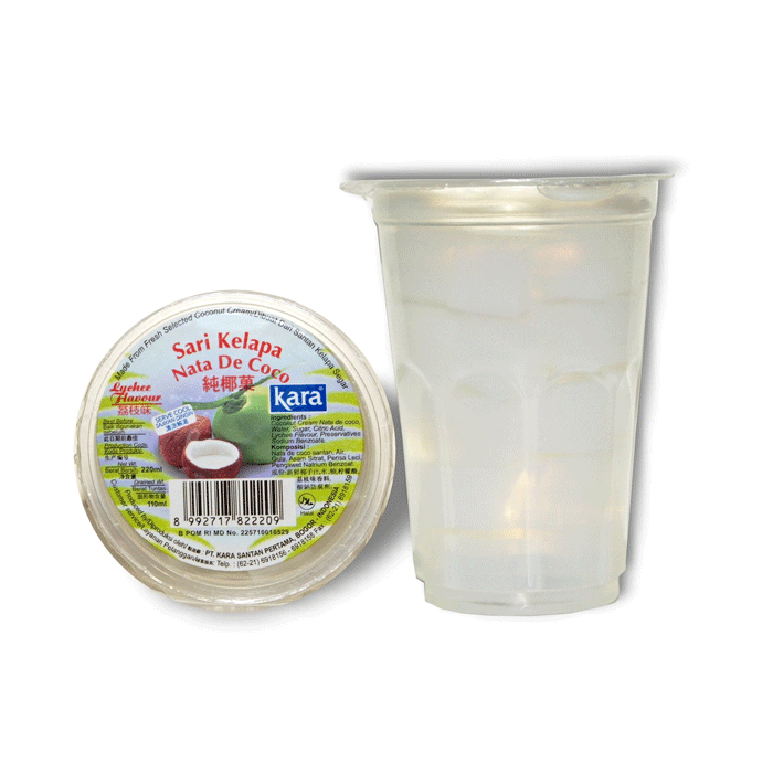 Nata de coco met lychee siroop. Nata de coco is taaie, doorschijnende jelly-achtige blokjes, hoofdzakelijk gemaakt van gefermenteerde kokoswater. Pure nata de coco is smaakloos, vandaar dat het vaak gemengd wordt met vruchtendranken, siroop of vers fruit.