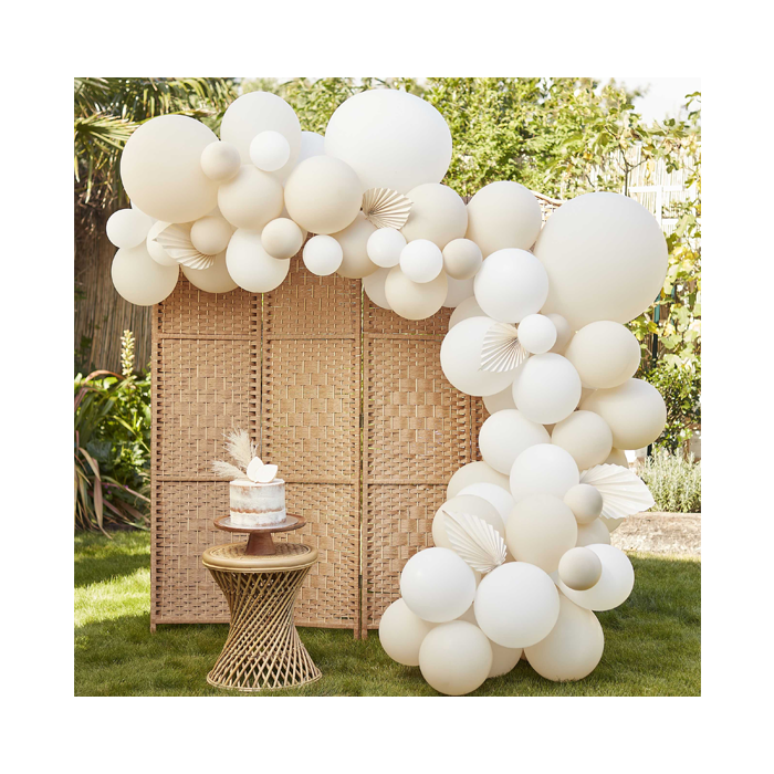 Creëer een prachtige backdrop op je feest met deze nude/beige en witte ballonnenboog set van Ginger Ray. Deze prachtige ballonnenboogset wordt compleet geleverd met 80 ballonnen en 5 papieren waaiers. Ook ontvang je 4 meter papieren ballontape, 40 lijmstippen en 3 meter wit touw meegeleverd voor eenvoudige montage. Latex ballonnen zijn biologisch afbreekbaar en de verpakking is recyclebaar en FSC-gecertificeerd.