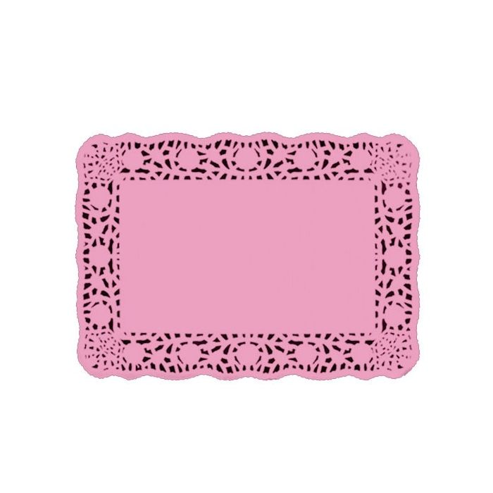 Roze onderleggers van papieren kant. De onderleggers hebben een afmeting van 25 x 35 cm en zijn verpakt per 10 stuks.