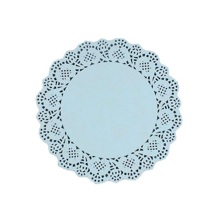 Blauwe onderleggers van papieren kant. De onderleggers hebben een doorsnede van 26 cm en zijn verpakt per 10 stuks.