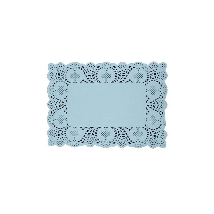 Blauwe onderleggers van papieren kant. De onderleggers hebben een afmeting van 19 x 30 cm en zijn verpakt per 10 stuks.