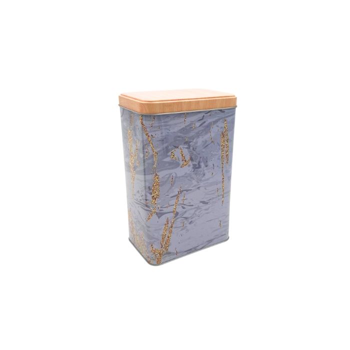 Mooie bewaarblik met een deksel, voorzien van een decoratieve grijs & goud marmer print, waar je allerlei etenswaren in kunt opbergen zodat deze langer vers blijven. De rechthoekige opbergblik heeft een afmeting van 19 x 12 x 8 cm.