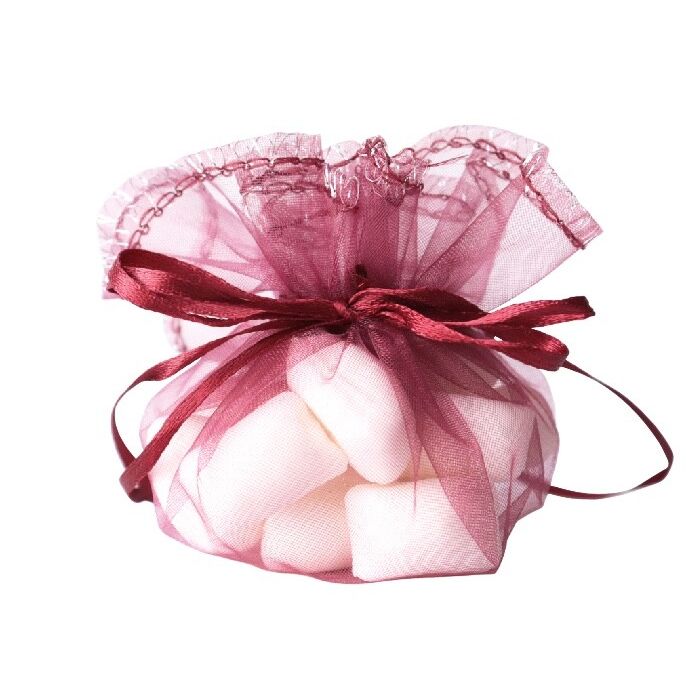 Ronde organzazak in de kleur bordeaux. Deze ronde organzazak met lint heeft een diameter van 24 cm. Door aan het lint te trekken wordt het platte stuk stof een mooi bol zakje. Per 12 verpakt.