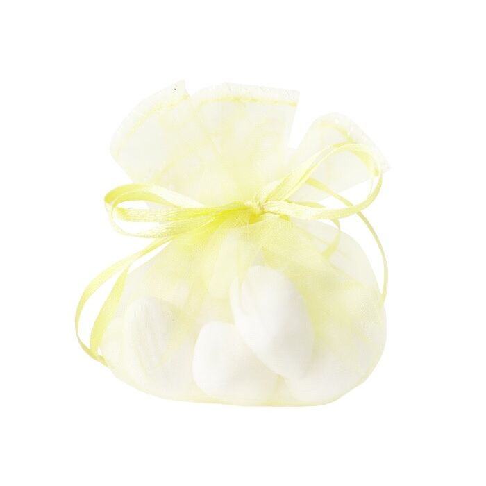 Ronde organzazak in het geel. Deze ronde organzazak met lint heeft een diameter van 24 cm. Door aan het lint te trekken wordt het platte stuk stof een mooi bol zakje. Per 12 verpakt.
