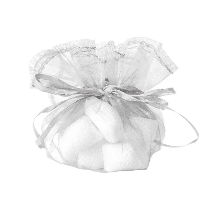 Ronde organzazak in zilver. Deze ronde organzazak met lint heeft een diameter van 24 cm. Door aan het lint te trekken wordt het platte stuk stof een mooi bol zakje. Per 12 verpakt
