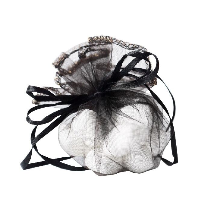 Ronde organzazak in de kleur zwart. Deze ronde organzazak met lint heeft een diameter van 24 cm. Door aan het lint te trekken wordt het platte stuk stof een mooi bol zakje. Per 12 verpakt