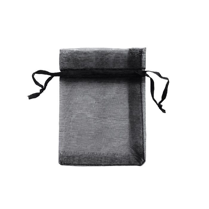 Kleine organzazak in de kleur zwart. Het zakje heeft een afmeting van 7 x 9 cm.