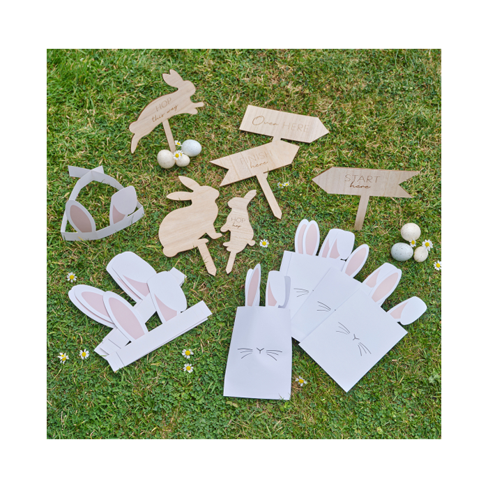 Je bent nooit te oud voor het zoeken van paaseieren. Creëer een onvergetelijke paaseierenjacht met deze leuke paaseierenzoekset van Ginger Ray. Met schattige konijnenhoofdbanden en snoepzakjes, gebruik je de houten bewegwijzering om aanwijzingen te planten voor de kleintjes (en volwassenen!) om die heerlijke paaslekkernijen te ontdekken! Deze paaseierenzoekset bevat: 6 x konijnen traktatiezakken 6 x konijnoren hoofdbanden 6 x houten borden.