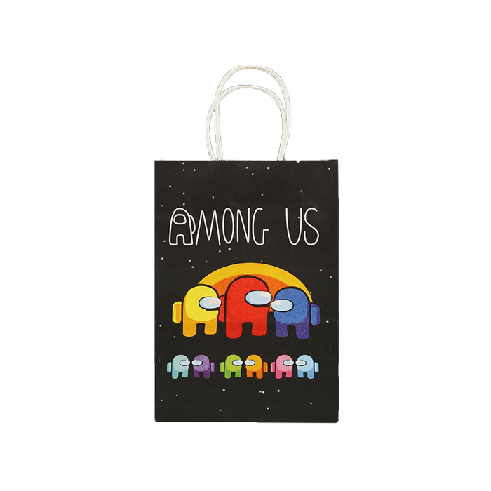 Papieren cadeautasjes met een afbeelding van Among Us spelfiguren. Elke verpakking bevat 6 tasjes. Elk tasje heeft een afmeting van 21x15x8cm (excl. handvat).