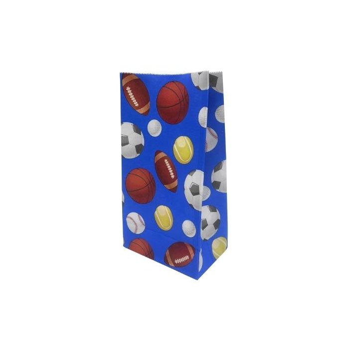 Blauwe papieren zakjes bedrukt met verschillende balsporten. Een zakje heeft een afmeting van 24 x 3 x 8 cm (lxbxh) en is verpakt per 10 stuks. Ideaal voor het vullen van snoep, snacks, uitdeelspeelgoed etc.