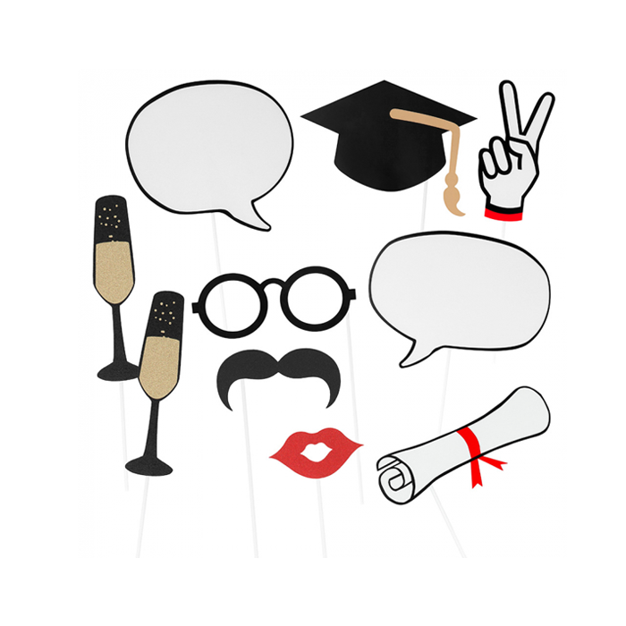 Een leuke photo booth prop set om onvergetelijke foto's te maken tijdens een examenfeest. De set bestaat uit 10 grappige foto props in leuke geslaagd vormpjes zoals een doctoraals muts, een diploma en tekstballonnetjes.