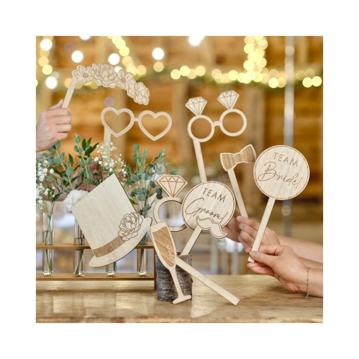 Breng wat plezier naar jullie bruiloft met de vrolijke Photobooth Props uit de 'Rustic Romance' collectie van Ginger Ray. Deze set bestaat uit tien houten props met prachtige gebrande details die jullie gasten voorzien van alles wat ze nodig hebben voor grappige en hartverwarmende foto's. Of het nu gaat om de leuke 'Team Bride' en 'Team Groom' borden, de elegante ring en snor, of de feestelijke champagne en hartvormige bril, elke prop voegt een uniek element toe aan jullie fotosessies. Dit is de perfecte manier om de feeststemming te verhogen en een leuke toevoeging aan jullie gastenboek of trouwalbum. Kies een prop, poseer en maak onvergetelijke herinneringen. De set bevat 10 houten photobooth props.