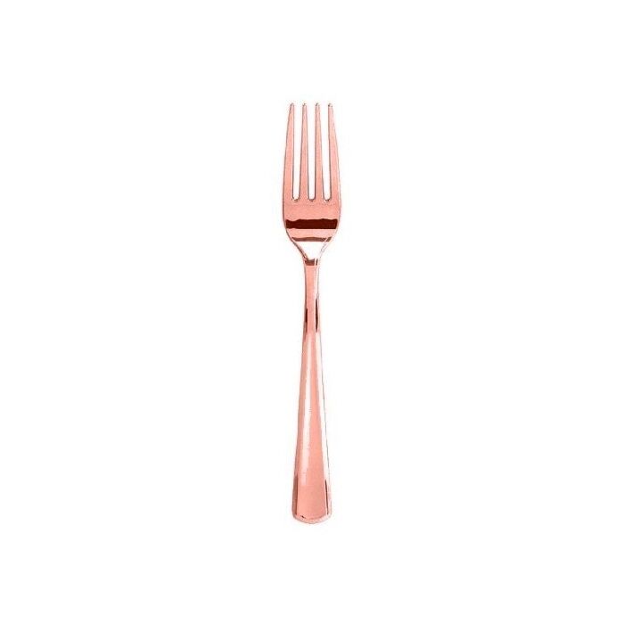 Stevige plastic dessertvorken in de kleur roségoud. De vorkjes hebben een uitstraling van metalen bestek.