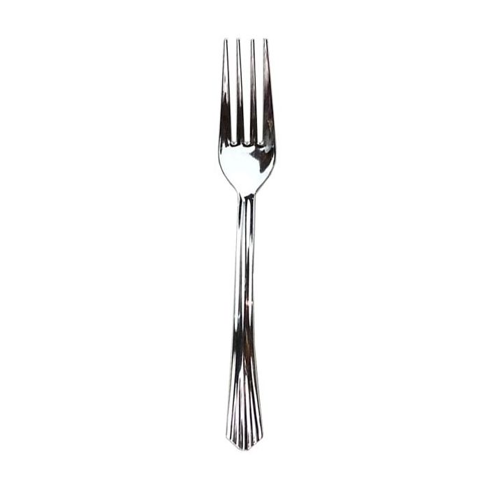 Stevige plastic vorken in de kleur zilver. De vorken hebben een uitstraling van metalen bestek. De vorken zijn 18 cm lang. Een pak bevat 10 vorken.