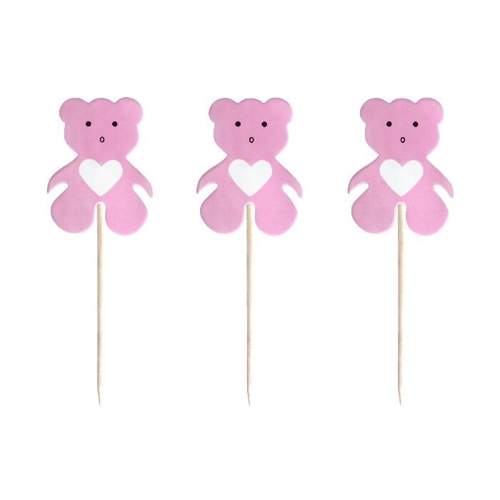 Schattige cupcake prikkertjes met een roze beertje aan de bovenkant, gemaakt van papier. De prikkers zijn 12,5cm lang en zijn verpakt per 12 stuks.