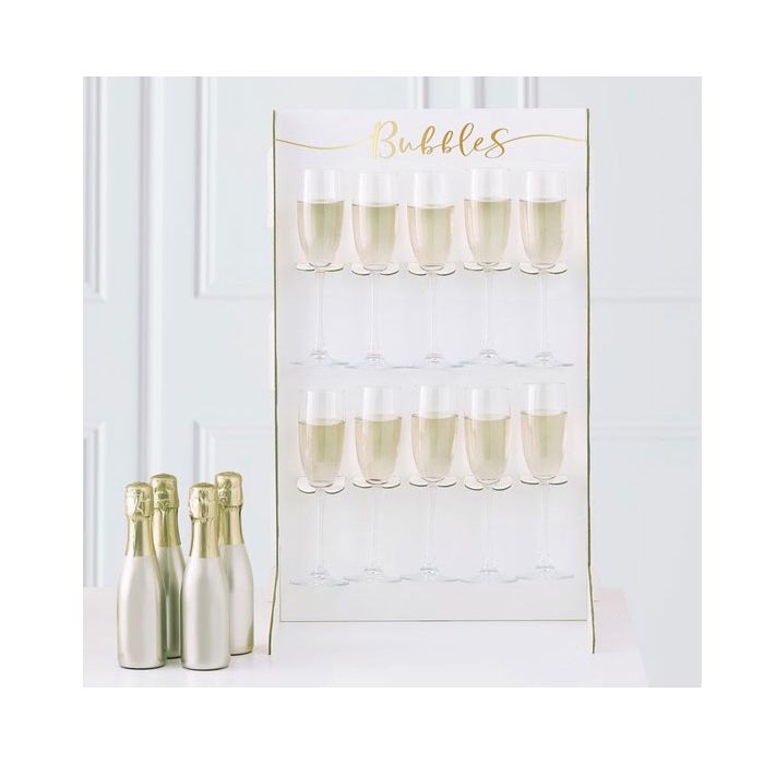 Stijlvolle kartonnen prosecco standaard van Ginger Ray met een hoogte van 60 cm. De standaard is van stevig karton gemaakt en bevat de tekst 'Bubbles' in het goud. De standaard bevat 10 drank houders.