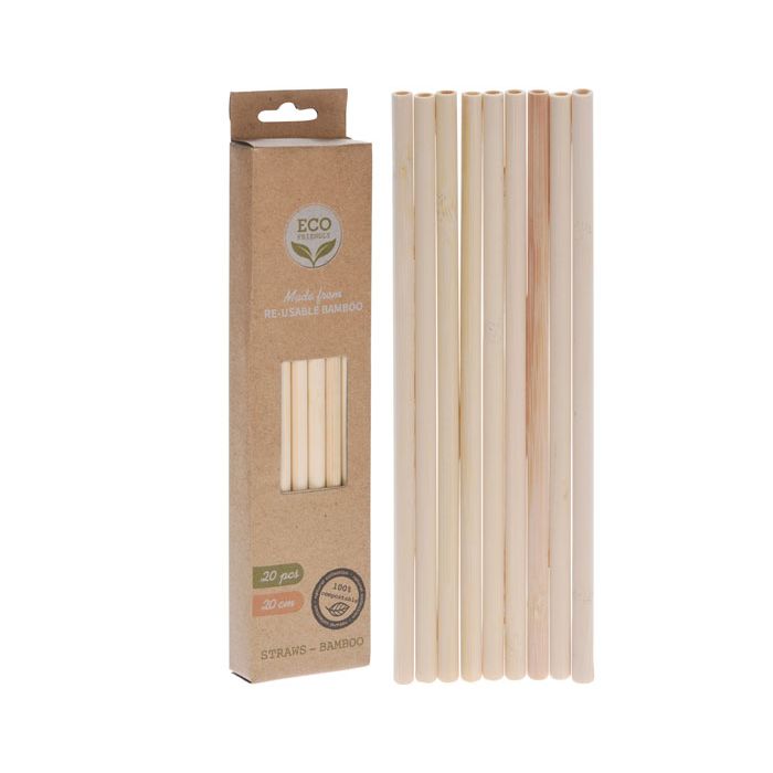 Milieuvriendelijke rietjes gemaakt van bamboe. De rietjes zijn herbruikbaar. Voor gebruik goed omspoelen. Een verpakking bevat 20 rietjes.
