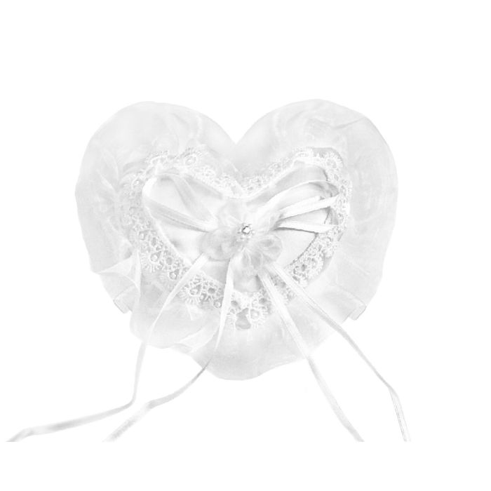 Hartvormige ringkussen van satijn en decoratie van kant. De ringkussen is circa 11x9cm groot.