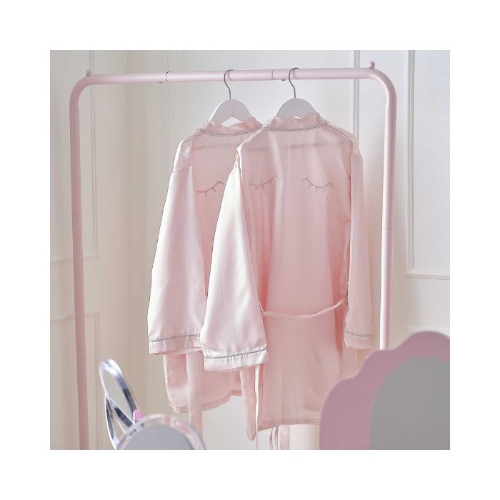 Elk pakket bevat: 1 x satijnen roze badjas, leeftijd 7-9 jaar, met geborduurde slaapogen op de achterkant