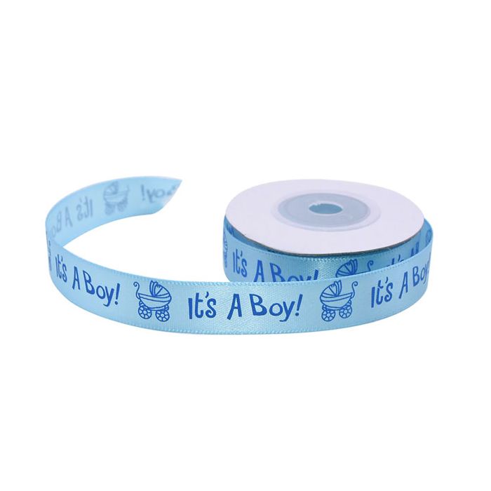 Cadeaulint van satijn bedrukt met 'It's a Boy'. De satijnlint is 1 cm breed en 22,8 m lang.