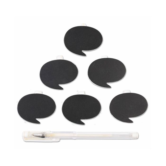 Kleine houten schoolbordjes in de vorm van een tekstballon op knijpers. Inclusief pen. Een set bestaat uit zes schoolbordjes en een pen.