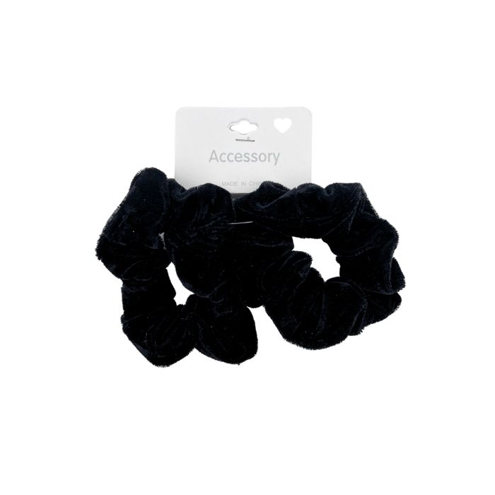 Set van twee scrunchies gemaakt van velvet stof in de kleur zwart. Deze zachte haarelastieken draag je in een knot, staart of gewoon om je pols.
