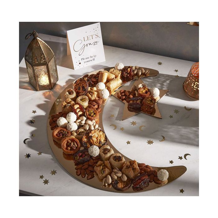 Serveer je hapjes tijdens Eid Mubarak uit op dit prachtige kartonnen maan en ster serveerplank. De serveerplank heeft een goude kleur en is 46,5x44,7cm groot. Inclusief 'Let's Graze' bordje.
