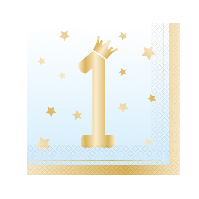 Mooie blauwe servetten voor de eerste verjaardag van je kindje! De servetten zijn 2-laags en zijn 33x33cm groot. Eén verpakking bevat 16 servetten.