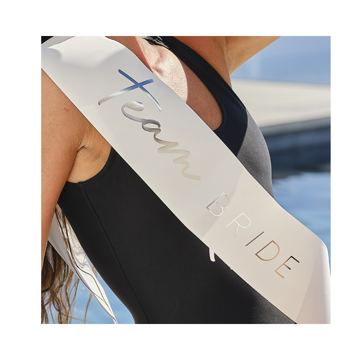 Kleed het hele Bride Team aan met deze prachtige wit en zilverkleurige Team Bride sjerpen van Ginger Ray. Elke verpakking bevat 6 Team Bride sjerpen van 1m lang met lint.