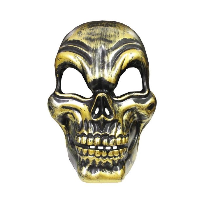 Gouden doodskop masker. Het masker is ca. 18 cm breed en 28 cm hoog. Aan het masker is een elastische band bevestigd.