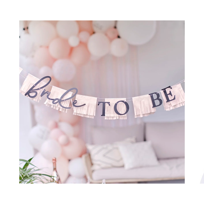 Prachtige Bride to be slinger met franjes van het merk Ginger Ray. Deze vlaggenlijn is zowel mooi als milieuvriendelijk en ziet er fantastisch uit. Het vormt de perfecte achtergrond voor foto's. Style deze prachtige slinger met vrijgezellenfeestversieringen uit de nieuwe Future Mrs-collectie. Elke verpakking bevat 1 vrijgezellenslinger van 1,5 m lang.