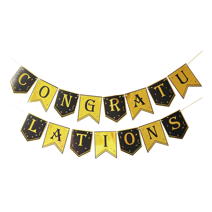 Slinger 'congratulations' gemaakt van stevig papier in de kleuren goud en zwart. Eén vlag heeft een afmeting van 15x18,5cm. De slinger is perfect om aan de muur te hangen wanneer jij iets te vieren hebt. Van verjaardag tot geslaagd feestje. Inclusief lint van 5 meter lang.