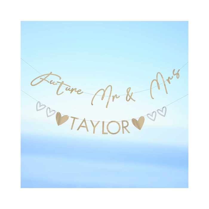 Versier je verlovingszaal met deze personaliseerbare Mr & Mrs-slinger met je nieuwe gezamenlijke achternaam! Deze verlovingsslinger bevat 1x Future Mr & Mrs-slinger met 12x letters om mee te personaliseren, 2 strengen van 1,5 m touw inbegrepen.